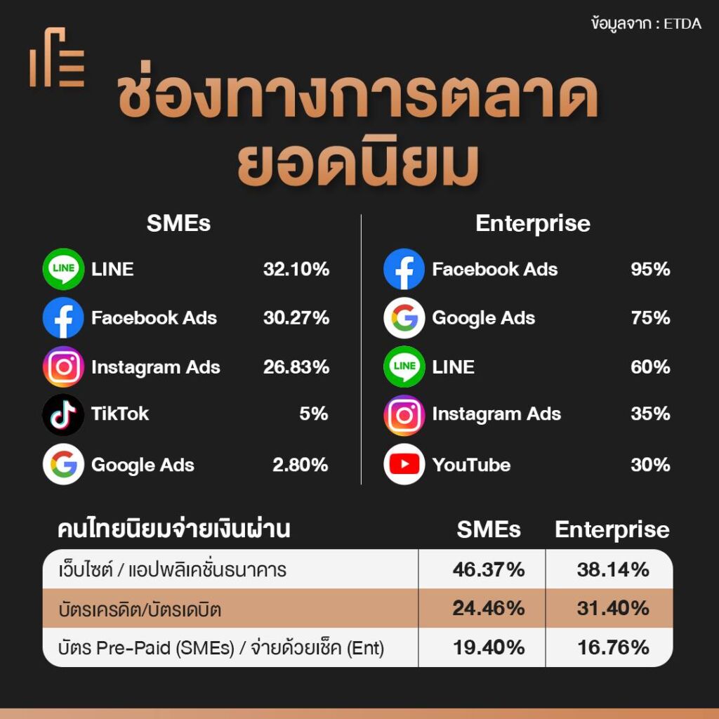นอกจากการใช้จ่ายของประชาชนแล้ว ในแง่ของแบรนด์เองก็มีการซื้อโฆษณาเพิ่มขึ้นเช่นกัน โดยแพลตฟอร์มที่ธุรกิจในกลุ่ม SMEs และกลุ่ม Enterprise จะมีการเลือกลงโฆษณาที่แตกต่างกัน