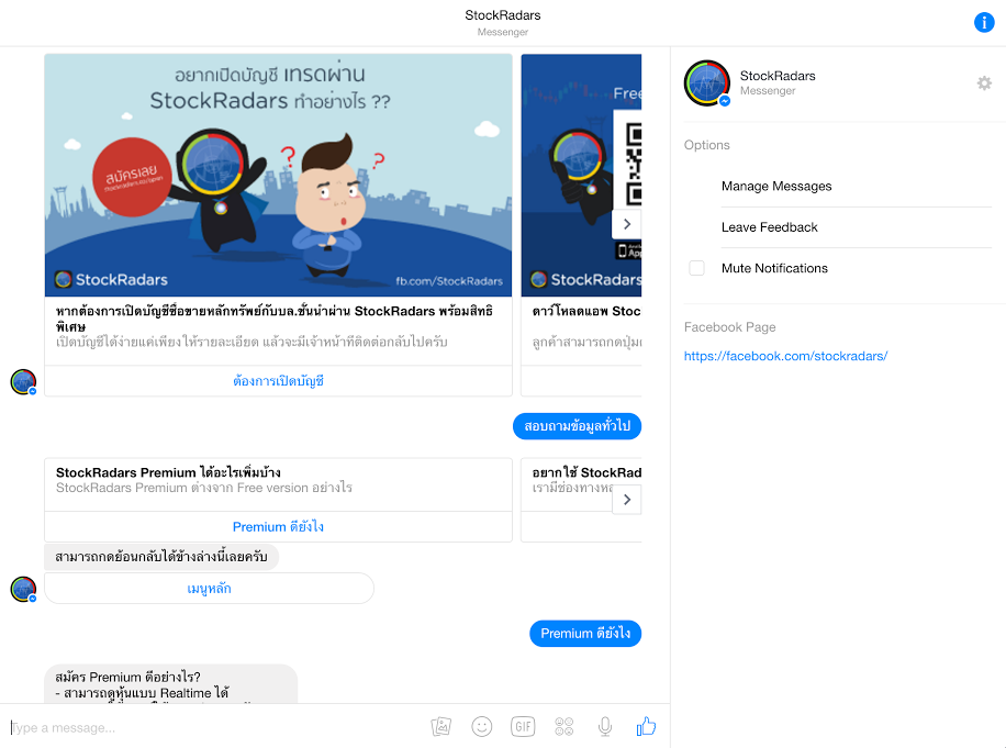 ล่าสุด StockRadars ผู้นำด้านแอปฯ วิเคราะห์หุ้นของไทยเปิดตัว Chatbot  บน Facebook Fanpage เพื่อให้นักลงทุนรุ่นใหม่สามารถสอบถามสินค้าและบริการของบริษัท “เนื่องจากในปัจจุบัน StockRadars มีผู้ใช้งานเข้ามาติดต่อสอบถามเป็นจำนวนมาก ทำให้หลายครั้งเกิดความล่าช้าในการให้บริการ ทางเรา จึงได้มีการประยุกต์นำ Chatbot เข้ามาใช้งาน โดยในเบื้องต้นจะให้บริการในส่วนของการช่วยเปิดบัญชีซื้อขายหลักทรัพย์กับ บล.พันธมิตร อย่างบล. โกลเบล็กซ์ การให้บริการข้อมูลเบื้องต้นกับลูกค้า การให้บริการลูกค้าหลังการขาย ทั้งนี้ทาง StockRadars ได้ร่วมมือกับ บริษัท Computerlogy ได้ร่วมพัฒนาเทคโนโลยีดังกล่าว เพื่อนำระบบ Chatbot เข้ามาการให้บริการอื่นๆได้ในอนาคต” ธีระชาติ ก่อตระกูล CEO StockRadars กล่าว
