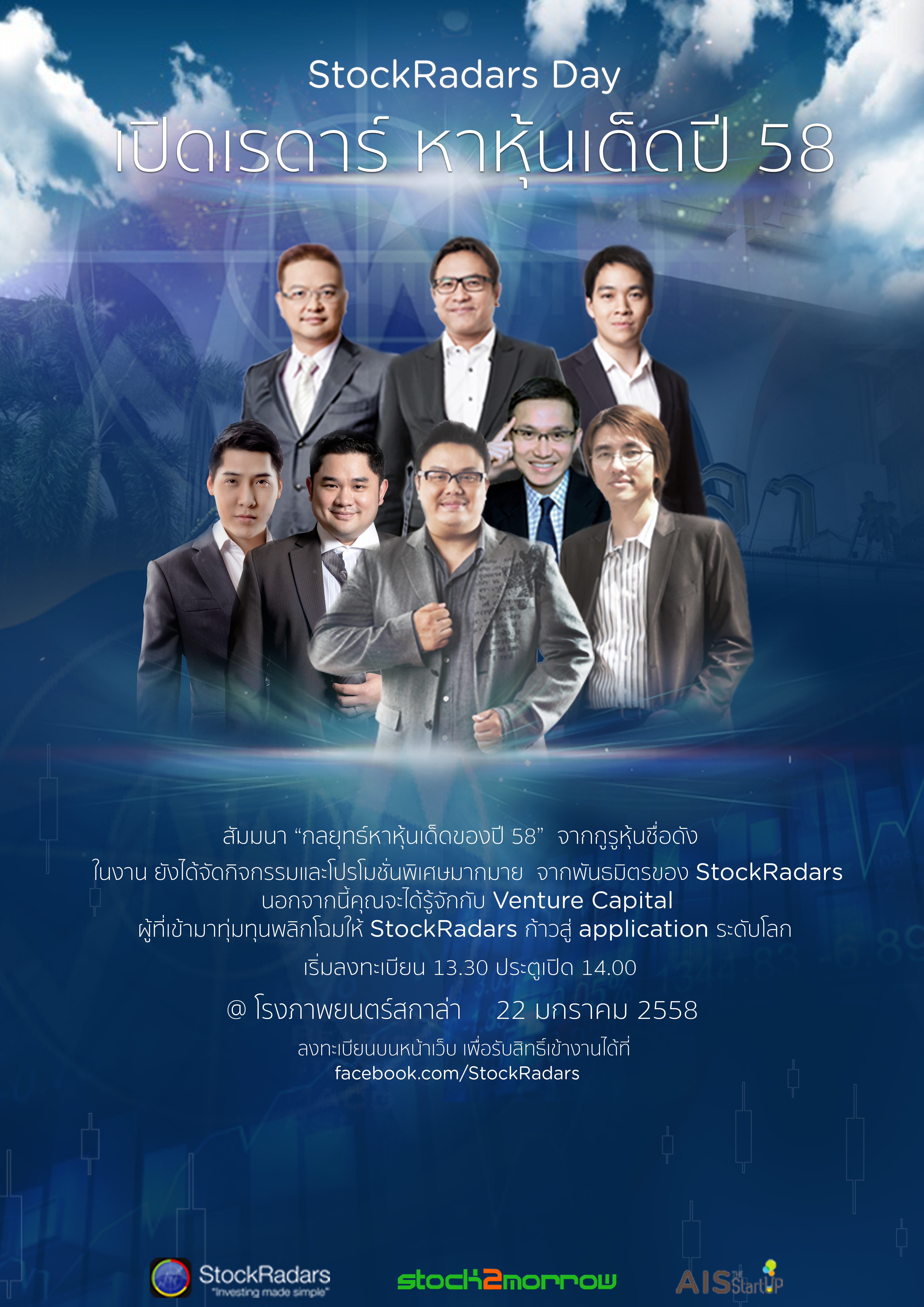 อีกหนึ่งข่าวดีของ Startup ข่าวแรกของปีเมื่อ StockRadars ประกาศจัดสัมมนาครั้งใหญ่ “เปิดเรดาร์ หาหุ้นเด็ดปี 58” จากเหล่าผู้เชี่ยวชาญด้านการลงทุน Stock2morrow และทางบรรณาธิการทราบมาว่าจะมีข่าวการเปิดตัวการลงทุนในตัวบริษัท StockRadars อีกด้วย