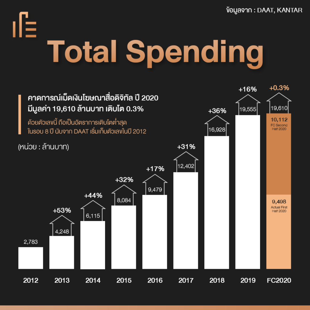 จากรายงานของสมาคมโฆษณาดิจิทัล (ประเทศไทย) หรือ DAAT ร่วมกับ คันทาร์ ประเทศไทย คาดการณ์เม็ดเงินโฆษณาสื่อดิจิทัล ปี 2020 มีมูลค่า 19,610 ล้านบาท เติบโต 0.3% ด้วยตัวเลขนี้ ถือเป็นอัตราการเติบโตต่ำสุดในรอบ 8 ปี นับจาก DAAT เริ่มเก็บตัวเลขในปี 2012