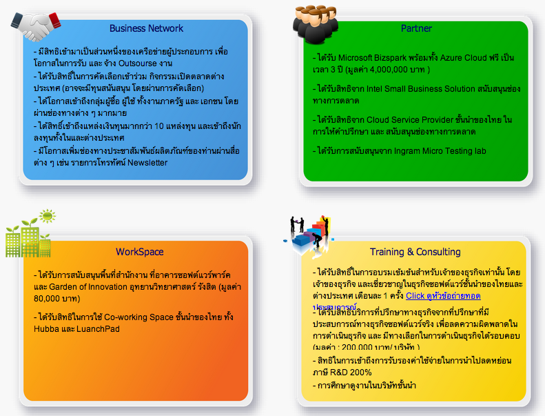 ในวาระครบรอบ 12 ปี ของการสนับสนุนให้เกิด Startup และ สนับสนุนให้บริษัทซอฟต์แวร์เติบโตตลอดมา Success ประจำปี 2556 (Incubation 12) จะได้รับสิทธิพิเศษต่าง ๆ เพื่อเตรียมพร้อมให้สามารถแข่งขันในตลาด AEC และ ตลาด Global