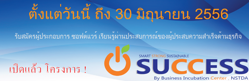 ศูนย์บ่มเพาะธุรกิจ สวทช. เขตอุตสาหกรรมซอฟต์แวร์ประเทศไทย ศูนย์บริหารจัดการเทคโนโลยี สำนักงานพัฒนาวิทยาศาสตร์และเทคโนโลยีแห่งชาติ(สวทช.) ขอเชิญผู้ประกอบกิจการซอฟต์แวร์และไอทีทุกประเภท ทั้ง ERP ,Mobile,Enterprise , Digital content,IT Consultant, IT Services, E-leaning, Game,Web ฯลฯ ที่ต้องการเตรียมตัวสร้างรากฐานให้องค์กรธุรกิจให้พร้อมต่อการเปลี่ยนแปลง และต้องการพันธมิตรเข้าร่วมโครงการ Success เพื่อต่อยอดความสำเร็จและเรียนลัดจากประสบการณ์ของผู้ที่ประสบความสำเร็จในธุรกิจแล้ว ภายใต้แนวคิด Smart, Strong, Sustainable