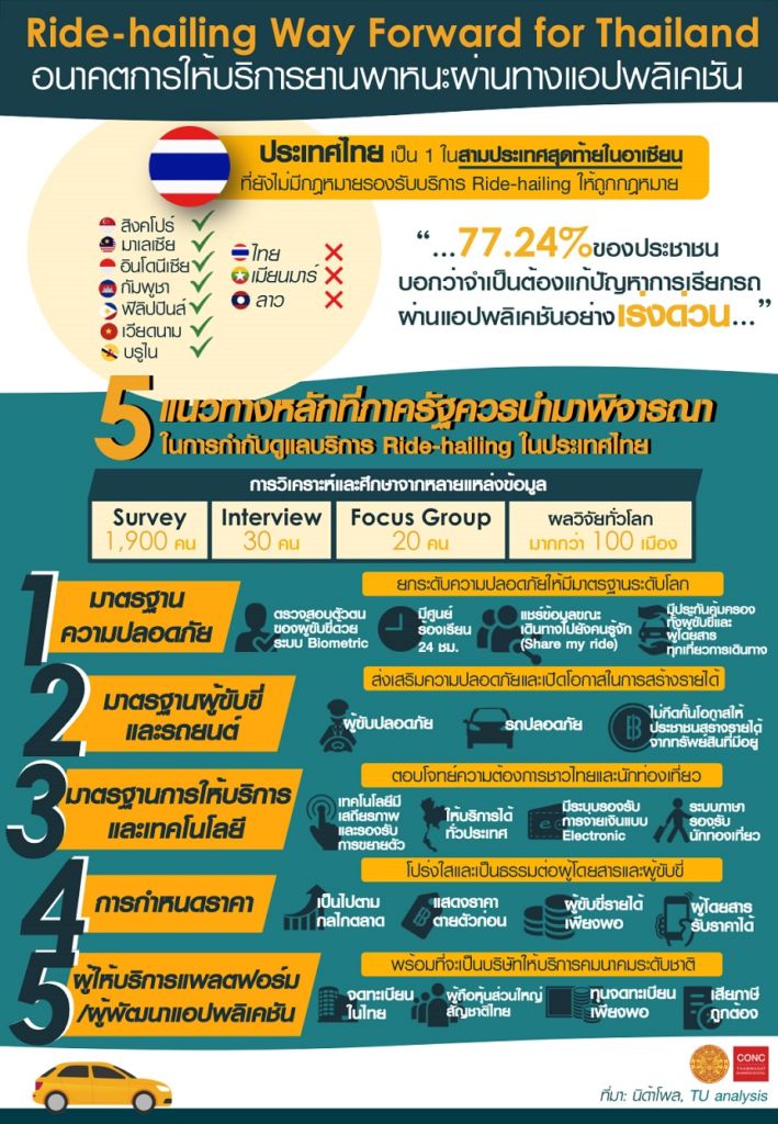 ศูนย์ให้คำปรึกษาและพัฒนาผู้บริหารทางธุรกิจแห่งมหาวิทยาลัยธรรมศาสตร์ (CONC Thammasat) ได้แถลงผลการศึกษาและวิจัยเชิงวิชาการภายใต้หัวข้อ “อุตสาหกรรมการให้บริการยานพาหนะผ่านทางแอปพลิเคชัน (Ride-hailing service): บทบาทในการสนับสนุนเศรษฐกิจไทยและความจำเป็นในการพัฒนาหลักเกณฑ์และกฎหมายให้ตอบโจทย์การพัฒนาที่ยั่งยืน”