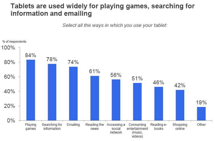 – 43% ยอมรับว่าใช้เวลาส่วนใหญ่กับ Tablet มากกว่า desktop/laptop และ กว่า 1/3 ให้เวลากับ Tablet มากกว่าการดูโทรทัศน์