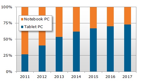 การคาดการณ์ยอดขายแท็บเล็ตและอุปกรณ์ไอทีในปี 2013 ของ NPD DisplaySearch แสดงให้เห็นว่ายอดขายแท็บเล็ตในปี 2013 อาจจะสูงกว่าปี 2012 ถึง 64% ซึ่งยอดขายแท็บเล็ตส่วนใหญ่จะมาจากแท็บเล็ตขนาด 7 – 8 นิ้วเป็นหลัก ดังนั้นจะนับเป็น 45% ของยอดขายรวมที่คาดการณ์ไว้ประมาณ 240 ล้านเครื่อง ส่วนโน๊ตบุ๊คนั้นถูกคาดการณ์ว่าจะขายได้ราว 207 ล้านเครื่อง