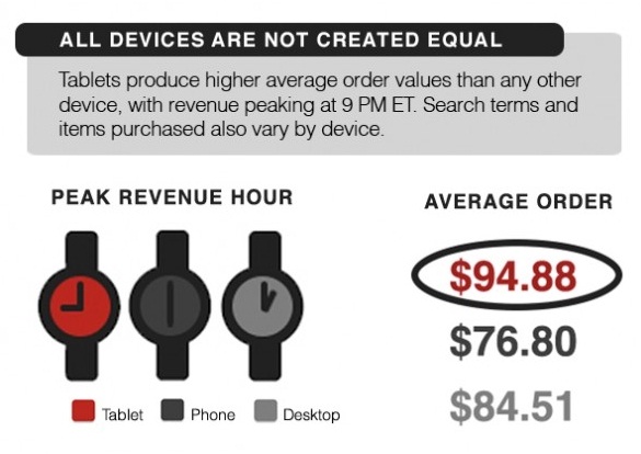 นอกจากนี้ผลสำรวจยังพบว่าแท็บเล็ตเป็นช่องทางที่สามารถทำมูลค่าเฉลี่ยในการซื้อสินค้าสูงที่สุดในบรรดาอุปกรณ์คอมพิวเตอร์ทั้ง 3 ชนิด ไม่ว่าจะเป็นคอมพิวเตอร์พีซีหรือโทรศัพท์มือถือ โดยมีมูลค่าการซื้อสินค้าผ่านแท็บเล็ตเฉลี่ยสูงสุดราว 94.88 เหรียญสหรัฐ ในขณะที่มูลค่าการสั่งซื้อสินค้าผ่านคอมพิวเตอร์ตั้งโต๊ะมีจำนวนตามหลังอยู่ที่ 84.51 เหรียญสหรัฐและโทรศัพท์มือถือ 76.8 เหรียญสหรัฐ