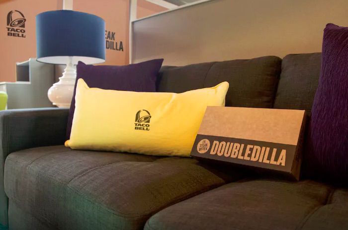 อีกความเก๋คือผู้เข้าพักจะสามารถเรียกใช้ “Taco Bell Butler” หรือบัทเลอร์ผู้ดูแลที่จะหุงหาอาหารมาบริการให้ทุกคนแบบไม่อั้นตลอดคืน ภาพล่างคือหมอนพิมพ์ของ Taco Bell ที่ทำให้แคมเปญห้องพักนี้ดูมืออาชีพและจริงจังขึ้นทันตา