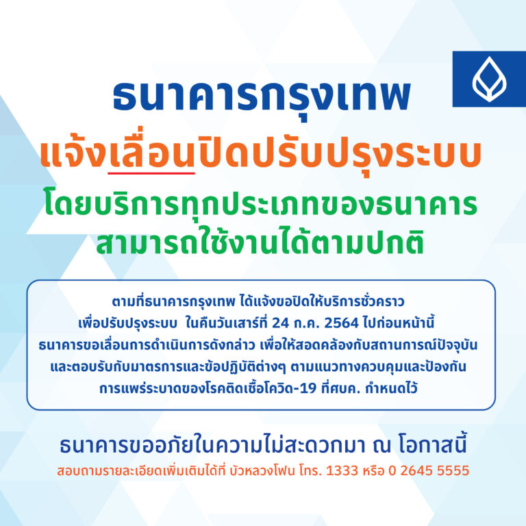 ธนาคารกรุงเทพ แจ้งเลื่อนปิดปรับปรุงระบบ บริการทุกประเภทของธนาคารสามารถใช้งานได้ตามปกติ