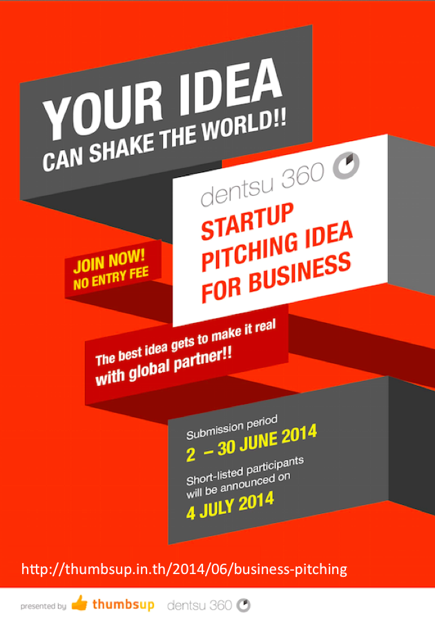 FeaturedDentsu360 เชิญชวน Startup ร่วมแข่งขัน “Your Idea Can Shake The World” เฟ้นหาพาร์ทเนอร์ธุรกิจ thumbsupteam June 2, 2014July 4, 2014