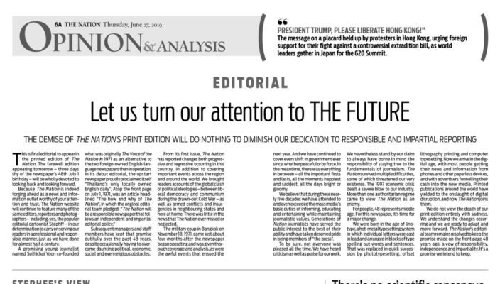 Business The Nation ออกบทบรรณาธิการอำลาก่อนตีพิมพ์ฉบับสุดท้ายในวันที่ 28 มิ.ย. 62The Nation ออกบทบรรณาธิการอำลาก่อนตีพิมพ์ฉบับสุดท้ายในวันที่ 28 มิ.ย. 62 Jenpasit June 28, 2019June 28, 2019