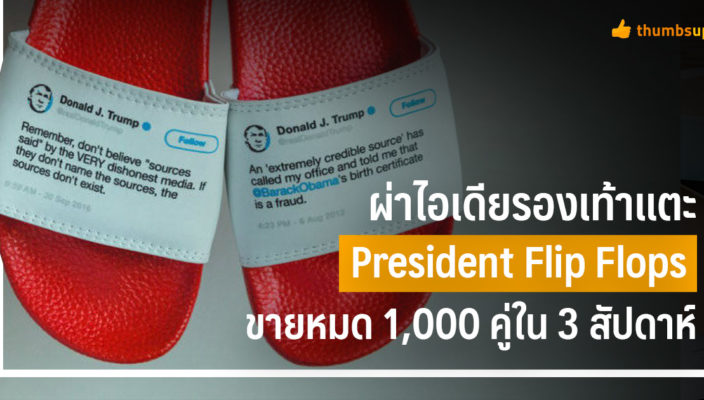 E-Commerce ผ่าไอเดียรองเท้าแตะติดทวีตทรัมป์ “President Flip Flops” ขายหมด 1,000 คู่ใน 3 สัปดาห์ผ่าไอเดียรองเท้าแตะติดทวีตทรัมป์ “President Flip Flops” ขายหมด 1,000 คู่ใน 3 สัปดาห์ darkhorse January 8, 2019January 8, 2019