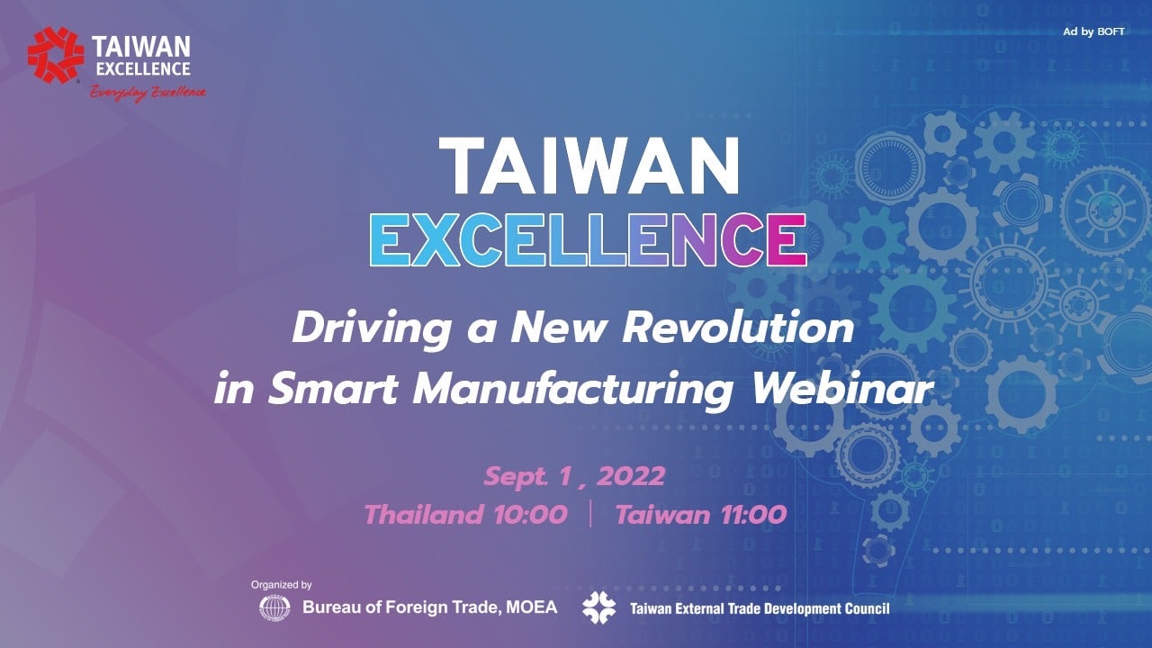 เพื่อส่งเสริมความร่วมมือระหว่างไทยและไต้หวันในอุตสาหกรรมการผลิตอัจฉริยะ กระทรวงเศรษฐกิจไต้หวัน (BOFT), R.O.C. และสภาส่งเสริมการค้าและการส่งออกไต้หวัน (TAITRA) เชิญบริษัทที่ได้รับรางวัล Taiwan Excellence 4 บริษัท ได้แก่ Chin Fong, Da Jie, Jainnher และ Tongtai สาธิตโซลูชันการผลิตอัจฉริยะ ในงานสัมมนาออนไลน์ หัวข้อ “Taiwan Excellence Driving a New Revolution in Smart Manufacturing Webinar” ในวันที่ 1 กันยายน 2022 เวลา 10.00 น. (GMT+7)