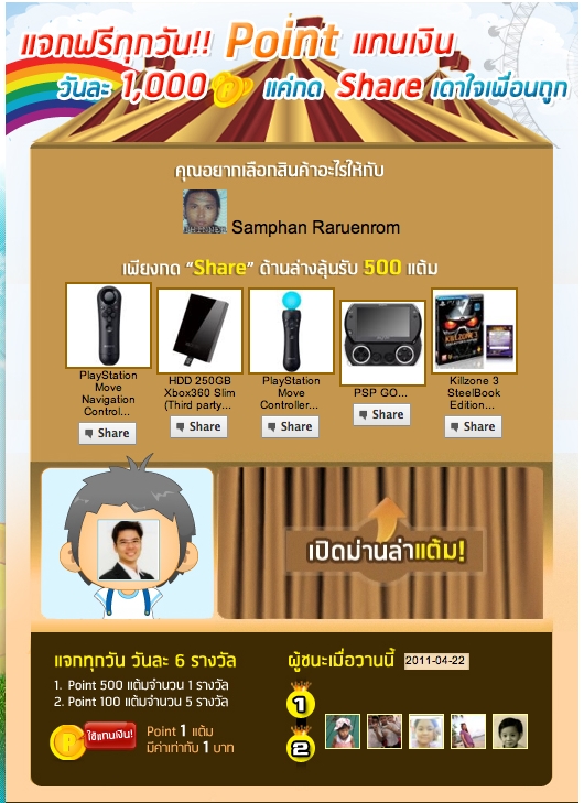 TARAD.com จัดกิจกรรมแจกแต้ม แจก Point ฟรีทุกวัน วันละ 1,000 แต้ม โดย 1 แต้มเท่ากับ 1 บาท สามารถนำไปซื้อสินค้าอะไรก็ได้ในเว็บไซต์ TARAD.com เพียงแค่ กด Share สินค้านำโชค ถ้าเลือกถูกรับแต้มไปเลย โดยขาช้อปสามารถเข้าไปร่วมสนุกได้ทุกวัน