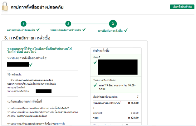 แล้วเมื่อระบบรับคำสั่งซื้อเรียบร้อยแล้ว คุณผู้อ่านก็จะได้รับการยืนยันทันทีแบบนี้ครับ (ต้องขออภัยที่ต้องนำแถบดำมาปิดข้อมูลต่างๆ ไว้ เนื่องจากทางทีมงานทำการสั่งซื้อสินค้าจริงๆ เพื่อพิสูจน์ประสบการณ์การใช้งานจริงด้วยตัวเอง)