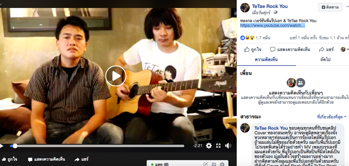 สถิตินี้น่าสนใจมาก เพราะเป็นสถิติที่โตก้าวกระโดดเมื่อเทียบกับวิดีโอก่อนหน้านี้ที่ TeTae Rock You และพี่แร็ปเอกร่วมร้องและเล่นในโพสต์เมื่อ 19 กรกฎาคม วิดีโอดังกล่าวแม้จะถูกเปิดชมมากกว่า 8 หมื่นครั้ง แต่ก็มียอดแชร์เพียง 30 ครั้ง ความคิดเห็น 27 รายการ