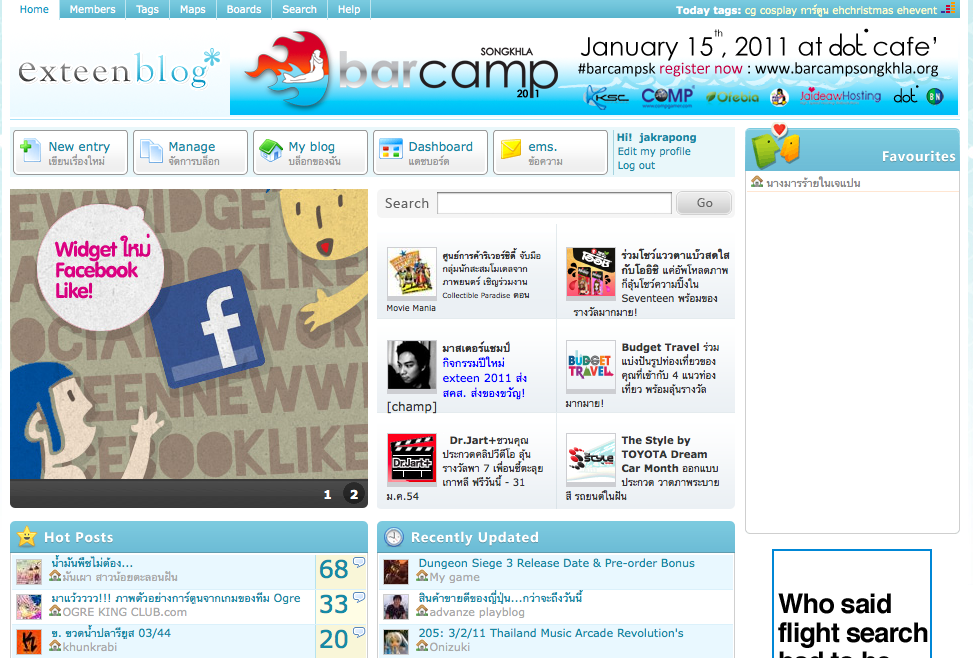 อาจจะดูแปลกไปถ้าแปลข่าวบล็อกต่างประเทศอย่าง WordPress แต่ไม่เหลียวกลับมามองบล็อกดีๆ ในบ้านเรากันบ้าง ที่เห็นชัดๆ 3 เจ้าใหญ่ เรียงลำดับโดยจำนวนผู้ใช้นั่นก็คือ exteen ของ เอทเซทโต (อันดับที่? 7) ตามมาด้วย Bloggang ของ อินเตอร์เน็ต มาร์เก็ตติ้ง หรือ Pantip.com (อันดับที่? 8) และ OKNation ของกลุ่มเนชั่น (อันดับ 22) ประเด็นที่น่าสนใจไม่แพ้ WordPress ที่เพิ่งนำเสนอไปก็คือบล็อกไทยเราทำอะไรให้กับผู้ใช้บ้าง รูปแบบธุรกิจเขาเป็นอย่างไร เรามาไล่ดูกัน