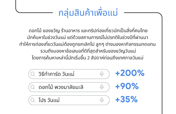 โดยคำค้นหาที่ได้รับความสนใจในช่วงเทศกาลวันแม่แบ่งออกได้เป็น 2 กลุ่ม คือ กลุ่มสินค้าเพื่อแม่ และกลุ่มสินค้าเพื่อลูก และเนื่องด้วยสถานการณ์ที่ไม่ปกติในช่วงปีที่ผ่านมาจนถึงปัจจุบัน ทำให้การค้นหาประเภทร้านอาหารและการท่องเที่ยวน้อยลง โดยลูกๆ ต่างมองหากิจกรรมทดแทนและข้อเสนอพิเศษต่างๆ สำหรับของขวัญในวันแม่ โดยการค้นหาเหล่านี้มักเริ่มขึ้น 2 สัปดาห์ก่อนถึงเทศกาลวันแม่
