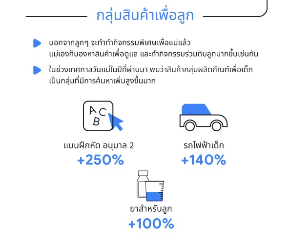 นอกเหนือจากลูกๆ จะหากิจกรรมพิเศษเพื่อแม่แล้ว กลุ่มคุณแม่ก็ยังมองหา “กลุ่มสินค้าเพื่อลูก” สำหรับทำกิจกรรมร่วมกับลูกเช่นกัน สินค้ากลุ่มผลิตภัณฑ์เพื่อเด็ก เป็น กลุ่มที่มีการค้นหาเพิ่มสูงขึ้นมาก