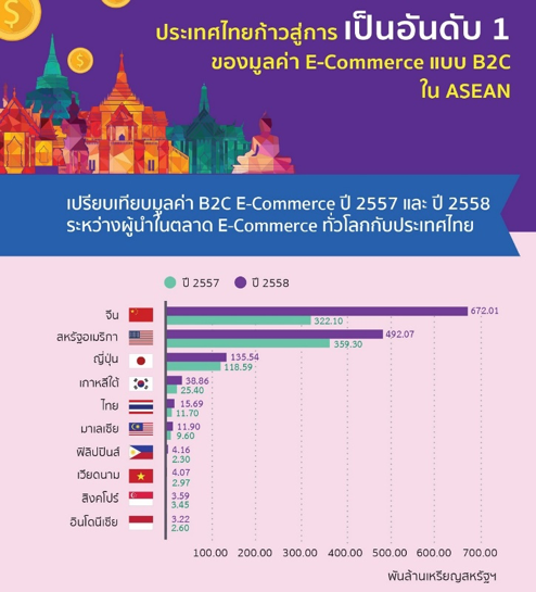 ตัวเลขมูลค่าของอีคอมเมิร์ซจากภาพด้านบนโดย ETDA จะเห็นว่าประเทศไทยมีมูลค่าสูงเป็นอันดับ 1 เมื่อเทียบกับประเทศในแถบอาเซียน ปัจจัยสำคัญที่มีการเติบโตนี้มีอยู่ 3 ปัจจัยหลัก ได้แก่ เทคโนโลยีที่มีการพัฒนาไปอย่างรวดเร็ว, นโยบาย Digital Economy และด้านการทำธุรกรรมการเงินที่เราคุ้นหูกันดีว่า Any ID หรือพร้อมเพย์ ที่ทั้งสามอย่างพร้อมดันความก้าวหน้าและเริ่มเห็นผลกันบ้างแล้ว
