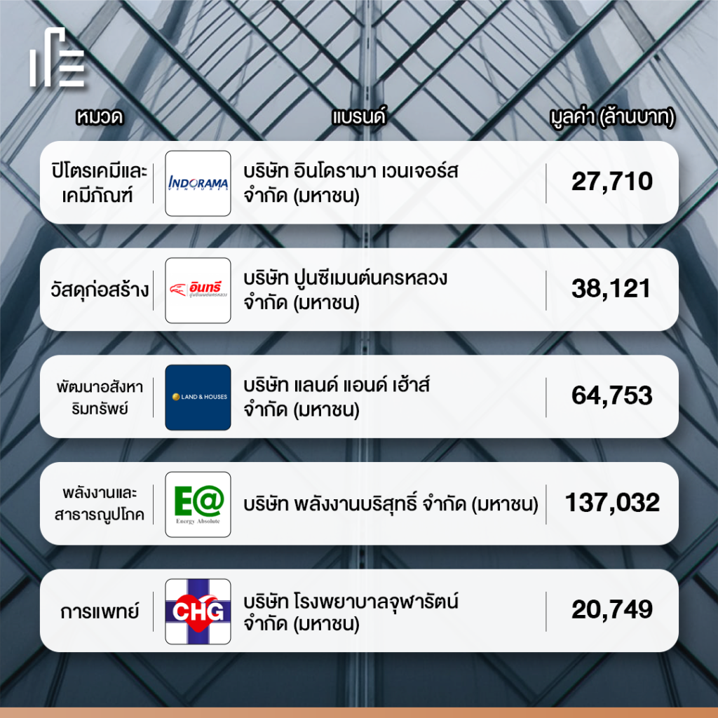 สำหรับองค์กรในประเทศไทยที่มีมูลค่าแบรนด์สูงสุด ใน 15 หมวด ได้แก่