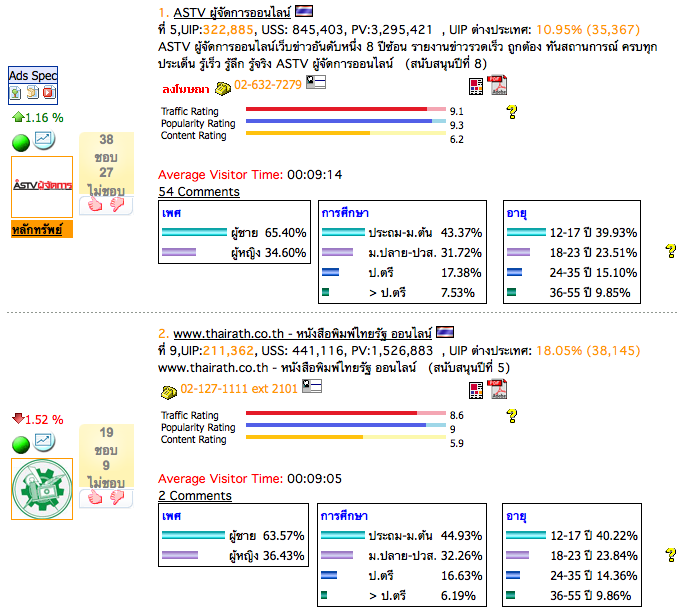 ในแวดวงการทำงานของอุตสาหกรรมอินเทอร์เน็ตไทย เว็บไซต์ประเภท “ข่าวและสื่อ” เป็นเว็บไซต์ที่มีสีสันน่าสนใจในแง่การพัฒนาไม่ใช่เล่นครับ เพราะนอกจากหนังสือพิมพ์เหล่านี้จะเป็นเจ้าของ Content เอง ยังสามารถสร้างความน่าติดตามได้จากคอลัมน์และสื่อมัลติมีเดียต่างๆ ให้เราเสพกันได้อย่างต่อเนื่อง ถ้าเราลองกลับเข้าไปดูที่ truehits ซึ่งเป็นเหมือนมาตรฐานในการวัดผลความสำเร็จด้านแทรฟฟิค บ่อยครั้ง เราจะเห็นได้ว่าเว็บไซต์ข่าวนั้นมีการแข่งขันกันสนุกสนานทีเดียว… ล่าสุด “ไทยรัฐ” แชมป์หนังสือพิมพ์ออฟไลน์ กำลังไต่อันดับ truehits หวังชิงตำแหน่ง แชมป์หนังสือพิมพ์ออนไลน์ที่ “ASTV ผู้จัดการ” ชนะไปก่อนหน้านี้ถึง 8 ปีซ้อน ปีนี้ “ไทยรัฐ” ขึ้นมาติดอันดับ 9 เรียบร้อยแล้ว ในขณะที่แชมป์เก่าอย่าง “ผู้จัดการ” นำอยู่ที่อันดับ 5