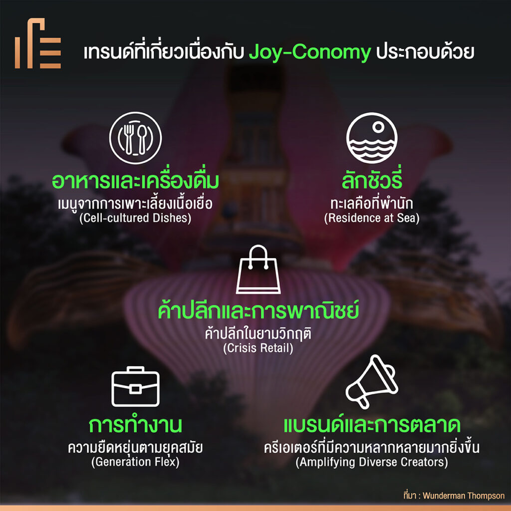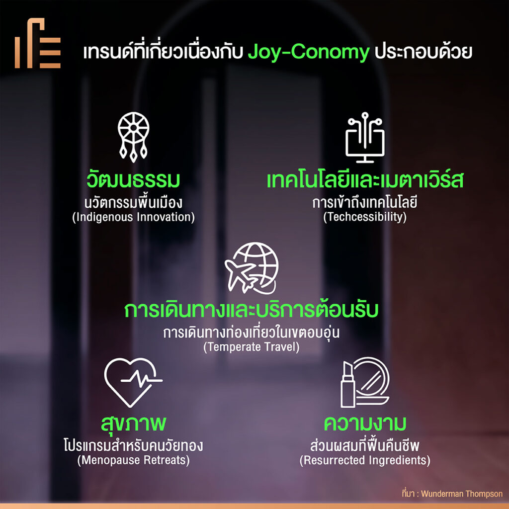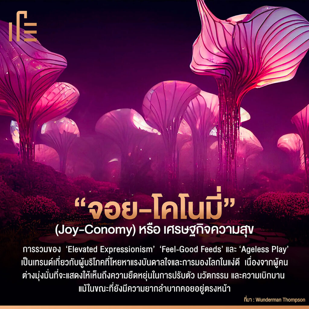 การก่อตัวของเทรนด์ต่างๆ อย่างเช่น ‘Elevated Expressionism’, ‘Feel-Good Feeds’ และ ‘Ageless Play’ ซึ่ง วันเดอร์แมน ธอมสัน อินเทลลิเจนซ์ (Wunderman Thompson Intelligence) ให้ชื่อเรียกว่า “จอย-โคโนมี่” (Joy-Conomy) หรือ เศรษฐกิจความสุข เผยให้เห็นโอกาสสำหรับแบรนด์ที่ให้ความสำคัญกับการที่ผู้บริโภคโหยหาแรงบันดาลใจและการมองโลกในแง่ดี เนื่องจากผู้คนต่างมุ่งมั่นที่จะแสดงให้เห็นถึงความยืดหยุ่นในการปรับตัว นวัตกรรม และความเบิกบาน แม้ในขณะที่ยังมีความยากลำบากคอยอยู่ตรงหน้าอย่างต่อเนื่อง