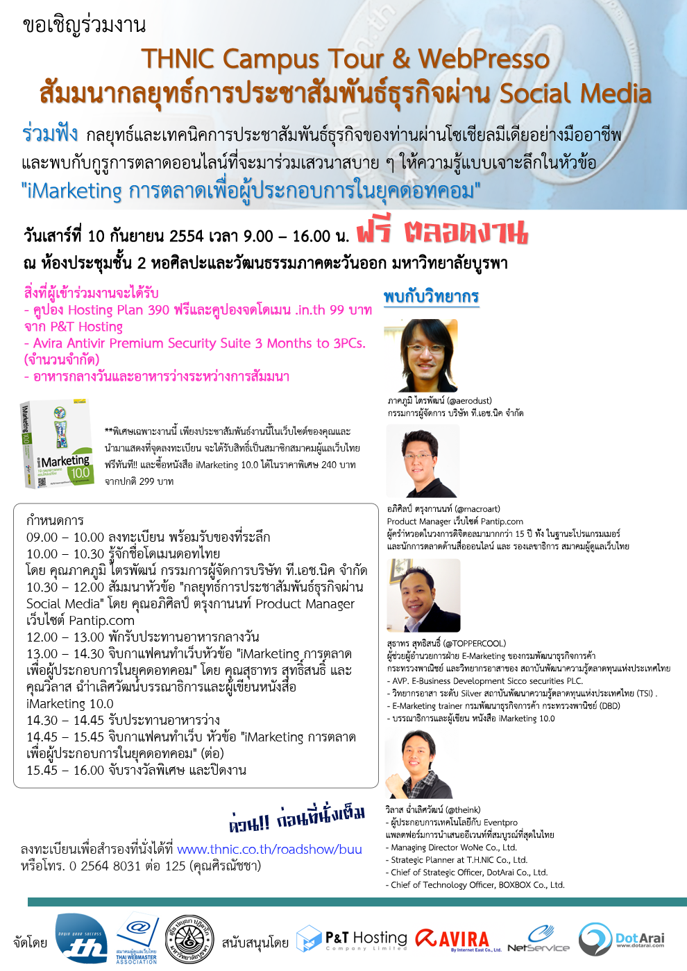 ทีเอชนิค และ สมาคมผู้ดูแลเว็บไทย ร่วมกับ คณะวิทยาการสารสนเทศ และ สำนักคอมพิวเตอร์ มหาวิทยาลัยบูรพา จัดงาน THNIC Campus Tour & WebPresso ร่วมฟังสัมมนาหัวข้อ ?กลยุทธ์การประชาสัมพันธ์ธุรกิจผ่าน Social Media? โดยคุณอภิศิลป์ ตรุงกานนท์ ผู้คร่ำหวอดในวงการดิจิตอลมากกว่า 15 ปี และพบกับกูรูการตลาดออนไลน์ที่จะมาร่วมเสวนาในหัวข้อ “iMarketing การตลาดเพื่อผู้ประกอบการในยุคดอทคอม”? ภายในงานมีการออกบูธให้คำปรึกษาเกี่ยวกับการจดโดเมนและการทำเว็บไซต์ พร้อมเล่นเกมแจกของรางวัลมากมายในวันเสาร์ที่ 10 กันยายน 2554 เวลา 9.00 ? 16.00 น. ณ ห้องประชุมชั้น 2 หอศิลปะและวัฒนธรรมภาคตะวันออก มหาวิทยาลัยบูรพา (ไม่เสียค่าใช้จ่าย)