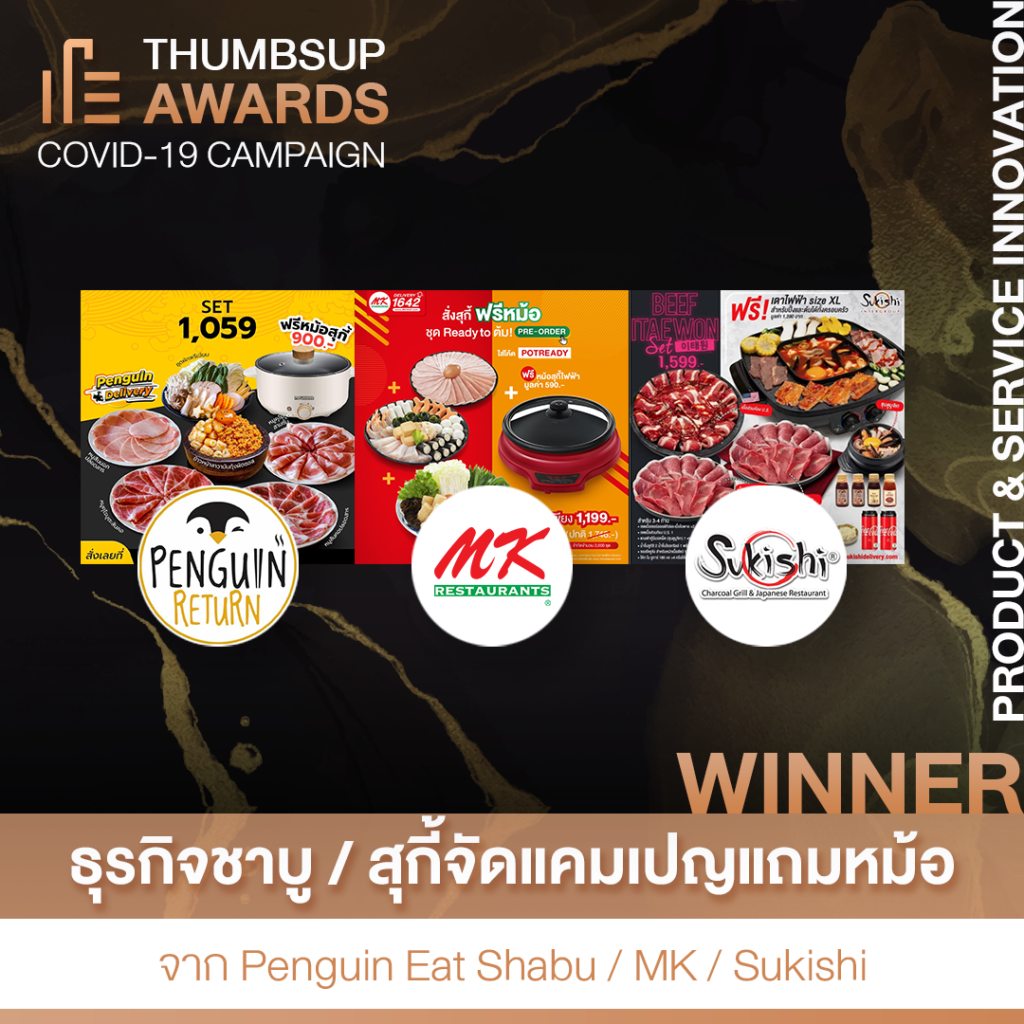 สำหรับธุรกิจชาบู/สุกี้ ที่เริ่มจัดแคมเปญซื้อสินค้าพร้อมแถมหม้อหรือกระทะเพื่อให้ลูกค้าไปใช้งานนั้น ต้องเรียกว่ามีต่อเนื่องกันมาเรื่อยๆ เพราะคนไทยชอบกินเมนูอาหารประเภทนี้ แต่ก็ไม่สะดวกที่จะออกนอกบ้าน ดังนั้นผู้ที่เข้ารอบในแคมเปญนี้มี 3 แบรนด์ได้แก่ เพนกวินอีทชาบู, เอ็มเค เรสโตรองค์ และ Sukishi ซึ่งทางทีมให้รางวัลกับทั้ง 3 แบรนด์ เพราะต่างก็เป็นธุรกิจที่พยายามหาทางรอดให้