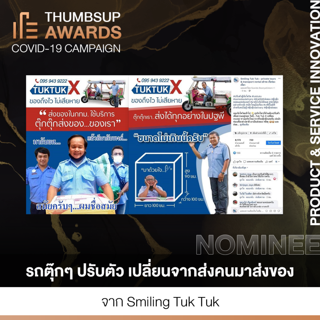 Smiling Tuk Tuk ธุรกิจให้บริการนำเที่ยว ปรับตัวจากในช่วงวิกฤตโควิด-19 ที่นักท่องเที่ยวลดลงจำนวนมาก ทำให้คนขับขาดรายได้ ขณะที่ในช่วงที่ผู้คนกักตัวอยู่บ้านธุรกิจซื้อขายออนไลน์กลายเป็นที่นิยม กลายเป็นที่มาของบริการ TukTuk X สำหรับส่งของทั่วกรุงเทพ จุดเด่นคือไม่จำเป็นต้องแพ็คของให้ยุ่งยากและมีรับประกันความเสียหาย