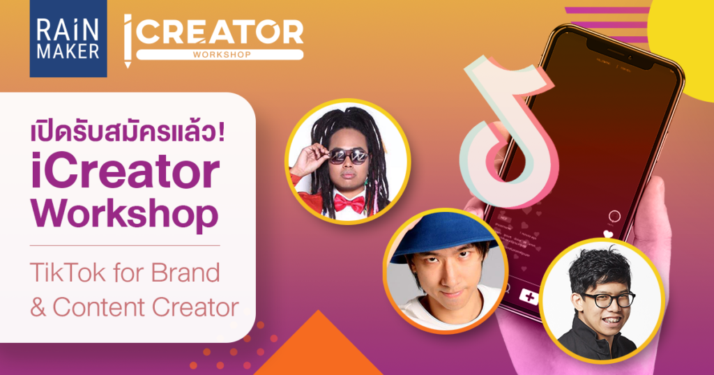 RAiNMaker เปิดตัว iCreator Workshop หลักสูตรใหม่! ” TikTok for Brand & Content Creator สร้างคอนเทนต์ให้ปัง เพิ่มผู้ติดตามให้แบรนด์บน TikTok ” ตอบโจทย์ผู้ที่สนใจสร้างคอนเทนต์บน TikTok ซึ่งเป็น Social Media ที่มาแรงที่สุดในตอนนี้
