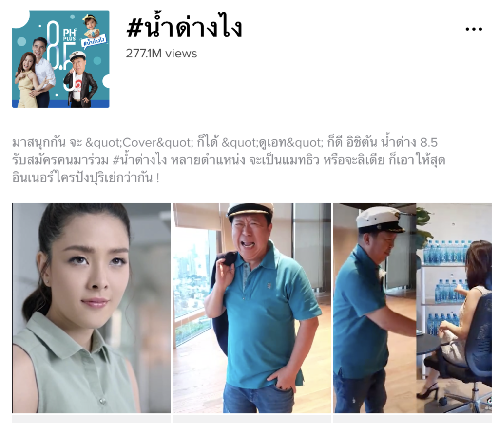 เช่น แบรนด์อิชิตันที่ได้สร้างสรรค์ #น้ำด่างไง แคมเปญลิปซิงค์ที่ท้าให้ผู้คนมาร่วม Duet กับคลิปวิดีโอต้นฉบับจากโฆษณาโดยพรีเซนเตอร์คนดัง ลิเดีย-แมทธิว เครื่องดื่มสุขภาพ PH Plus 8.5 หรือ อิชิตัน น้ำด่าง 8.5 ผสมวิตามินบี ซึ่งเรียกได้ว่าเป็นแคมเปญลิปซิงค์ครั้งแรกที่สามารถสร้างการมีส่วนร่วมกับผู้คนบนแพลตฟอร์มจนเป็นหนึ่งในลิปซิงค์ไวรัลดังที่โดดเด่นด้วยการนำเอาคำพูดของพรีเซนเตอร์มาลิปซิงค์ประกอบท่าทางเลียนแบบโฆษณา ที่สามารถสร้างยอดวิวรวมกว่า 277 ล้าน