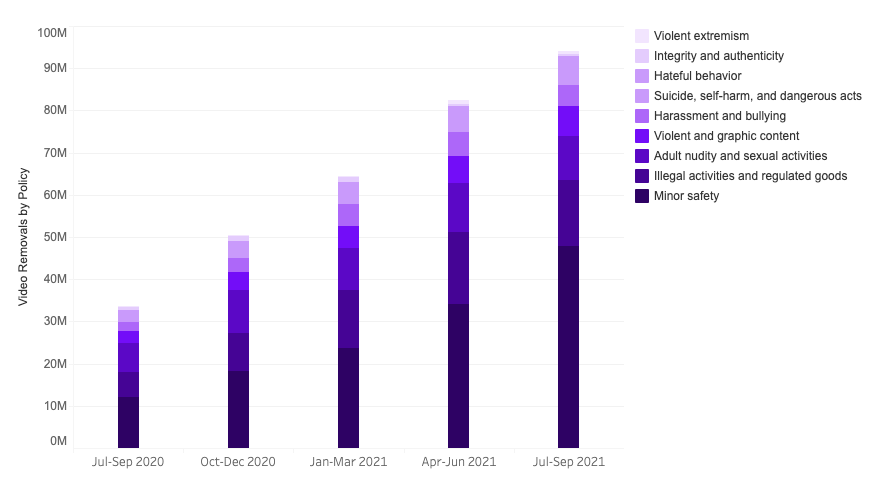 - ปริมาณวิดีโอที่ถูกลบ มาจากการละเมิดนโยบายด้านความปลอดภัยเป็นจำนวนมากที่สุด เกือบ 50 ล้านคลิป รองลงมาคือ กิจกรรมผิดกฎหมายและสินค้าควบคุม การเปลือยกายและพฤติกรรมทางเพศ ตามลำดับ โดยใน 1 วิดีโอ อาจมีการละเมิดหลักเกณฑ์ในหลายข้อ ซึ่งแต่ละการละเมิดต่างมีผลต่อการดำเนินการทั้งหมด
