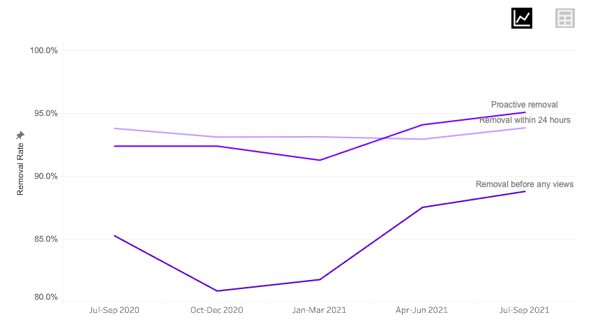 - ในจำนวนนั้น 95.1% ถูกลบออกก่อนมีการรายงาน และ 88.8% ถูกลบออกก่อนที่จะมีการดู และอีก 93.9% ถูกลบภายใน 24 ชั่วโมงหลังจากการโพสต์