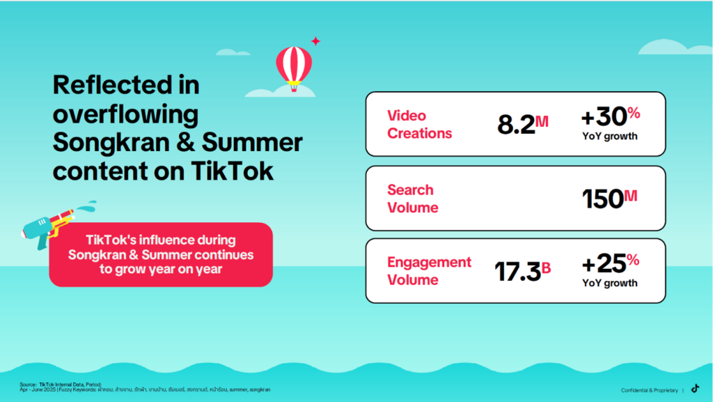 TikTok ได้รับการพิสูจน์แล้วว่าเป็น Growth Partner ที่ทรงพลัง โดยเฉพาะในช่วงสงกรานต์ที่ไม่ได้จบลงใน 3 วัน แต่เป็นจุดเริ่มต้นของแรงกระเพื่อมการบริโภคที่ยาวไปตลอดซัมเมอร์ ด้วยตัวเลขการค้นหาที่พุ่งสูงกว่า 150 ล้านครั้ง และ Engagement Volume ที่เติบโตถึง 25% เมื่อเทียบกับปีก่อนหน้า สะท้อนให้เห็นว่าแพลตฟอร์มนี้คือ “Digital Town Square” ที่ผู้คนเข้ามาออกแบบสงกรานต์ของตัวเองผ่านสิ่งที่เรียกว่า Seasonal Planning