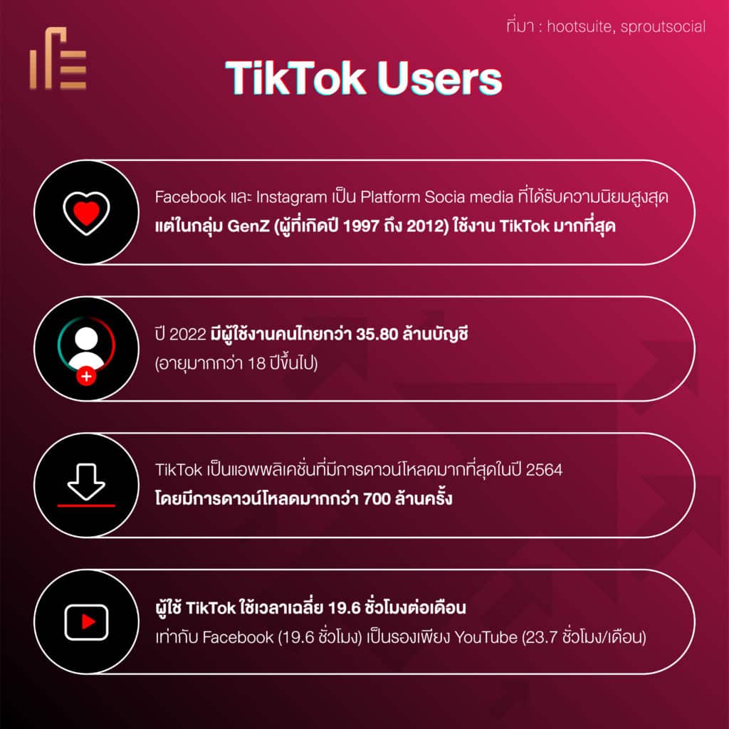 - ผู้ใช้ TikTok ใช้เวลาเฉลี่ย 19.6 ชั่วโมงต่อเดือนเท่ากับ Facebook (19.6 ชั่วโมง) เป็นรองเพียง YouTube (23.7 ชั่วโมงต่อเดือน)