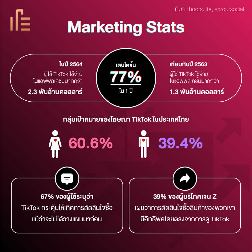 - ในปี 2564 ผู้ใช้ TikTok ใช้จ่ายในแอพพลิเคชั่นมากกว่า 2.3 พันล้านดอลลาร์ เทียบกับปี 2563 ที่มีการใช้จ่าย 1.3 พันล้านดอลลาร์ใน ถือเป็นการเติบโตกว่า 77% ใน 1 ปี