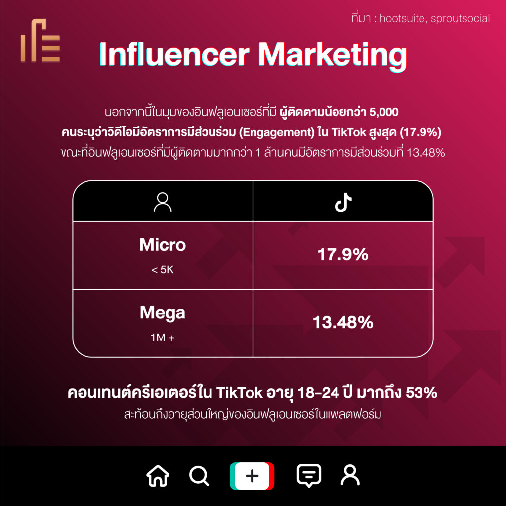 - นอกจากนี้ในมุมของอินฟลูเอนเซอร์ที่มีผู้ติดตามน้อยกว่า 5,000 คนระบุว่าวิดีโอมีอัตราการมีส่วนร่วม (Engagement) ใน TikTok สูงสุด (17.9%) ขณะที่อินฟลูเอนเซอร์ที่มีผู้ติดตามมากกว่า 1 ล้านคนมีอัตราการมีส่วนร่วมที่ 13.48%