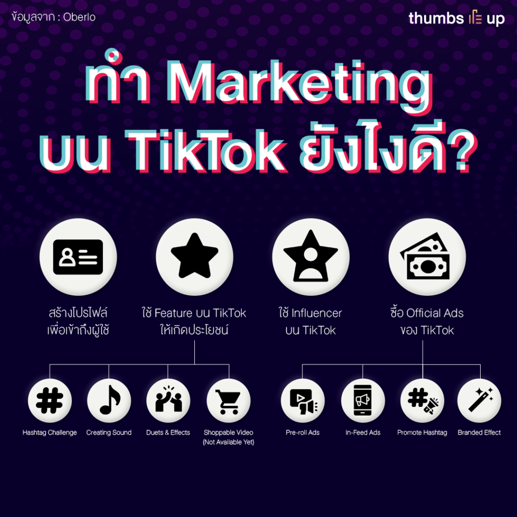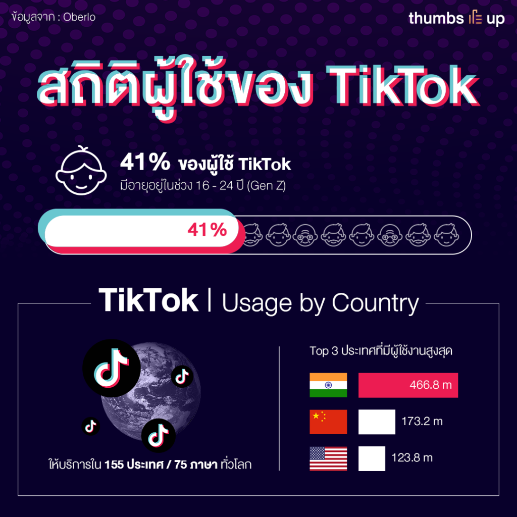 วันนี้ thumbsup จึงนำข้อมูลสถิติที่น่าสนใจของ TikTok จาก Oberlo มาสรุปเป็น infographic สั้นๆ และชี้ช่องทางการทำการตลาดบน TikTok แบบคร่าวๆ ให้ผู้อ่านทุกท่านได้นำไปใช้กันครับ
