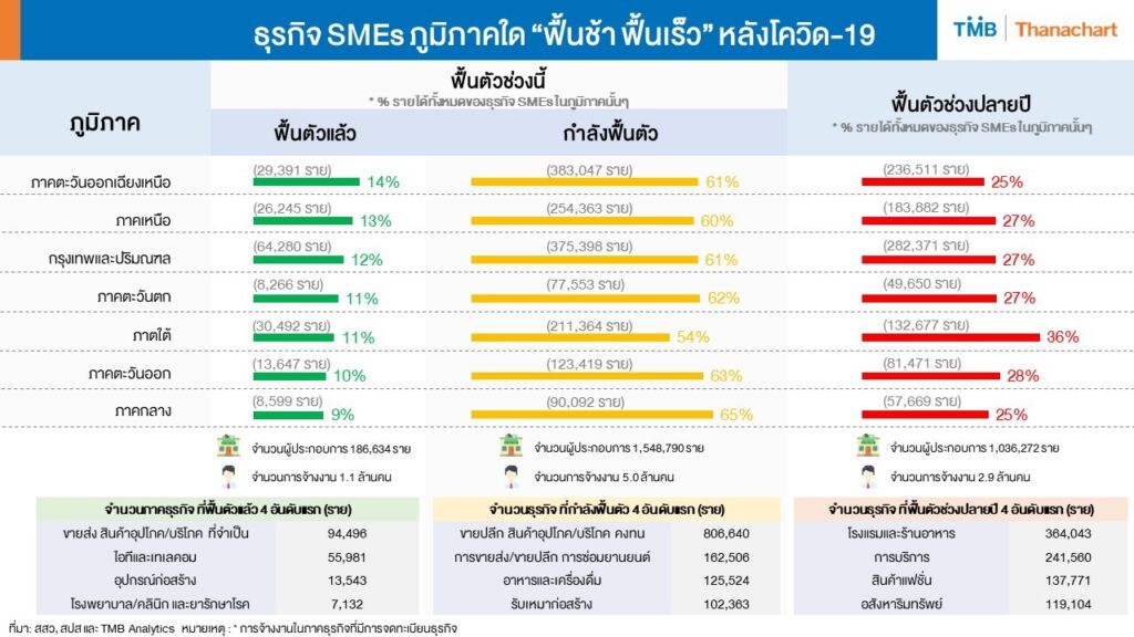 สรุปผลการศึกษาแนวโน้มการฟื้นตัวของธุรกิจ SMEs ของแต่ละภูมิภาค พบว่าภาคตะวันออกเฉียงเหนือ ภาคเหนือ กรุงเทพและปริมณฑล มีแนวโน้มฟื้นตัวได้เร็ว ตามสัดส่วนธุรกิจ SMEs ที่ฟื้นตัวแล้วและกำลังฟื้นตัวที่มีสัดส่วนที่สูง และธุรกิจส่วนใหญ่ของ SMEs เป็นกลุ่มสินค้าอุปโภคบริโภคในชีวิตประจำวันซึ่งพึ่งพิงตลาดในประเทศเป็นหลัก