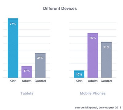 Mixpanel ได้แบ่งกลุ่มตัวอย่างออกเป็น 3 กลุ่ม ได้แก่ เด็ก, วัยรุ่น และกลุ่มควบคุมที่ประกอบไปด้วยคนในหลายช่วงอายุ ผลสำรวจพบว่าเด็กนิยมเล่นเกมบนแท็บเล็ตสูงถึง 77% ในขณะที่กลุ่มวัยรุ่นเล่นเกมบนแท็บเล็ตเพียง 17% และในทางกลับกัน เด็กนิยมเล่นเกมบนโทรศัพท์เพียง 10% ในขณะที่วัยรุ่น 65% ชอบเล่นเกมบนโทรศัพท์