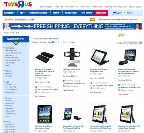 ที่ผ่านมา Toys R Us ได้จำหน่ายอุปกรณ์เสริมสำหรับ iPad 2 อยู่เป็นจำนวนไม่น้อยอยู่แล้ว แต่ล่าสุดร้านของเล่นเด็กนี้ได้เริ่มจำหน่าย iPad 2 แล้ว อย่างไรก็ดี ใช่ว่าใครจะเดินเข้าไปแล้วได้เครื่องเลยทันที เนื่องจาก iPad 2 จะถูกวางจำหน่ายเฉพาะบางสาขาของ Toys R Us ใน Los Angeles เท่านั้น และเนื่องจากจำนวนเครื่องที่จำกัดมาก รวมถึงความต้องการที่ถล่มทลาย ทำให้สาขาหนึ่งใน Tustin ใน California ขายเครื่องได้หมดตั้งแต่ 10 โมงเช้า ทั้งๆ ที่ร้านเปิด 9 โมง ทำให้ Toys R Us เองไม่สามารถผลักดันให้มีการวางจำหน่าย iPad 2 ได้ทุกสาขาของตัวเอง