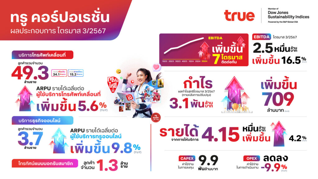 บริษัท ทรู คอร์ปอเรชั่น จำกัด (มหาชน) รายงานผลประกอบการไตรมาส 3/2567 เผยมีกำไรต่อเนื่อง โดยมีกำไรสุทธิหลังหักภาษีและหลังปรับปรุงรายการพิเศษ (Normalized Net Profit After Tax) ที่ 3.1 พันล้านบาท EBITDA ปรับตัวเพิ่มขึ้นเป็นไตรมาสที่ 7 ติดต่อกัน โดยมีปัจจัยหลักจากการลดลงของค่าใช้จ่ายในการดำเนินงานจากการมุ่งเน้นผลการดำเนินงานและประสิทธิภาพที่ดีขึ้น พร้อมการรับรู้ผลประโยชน์จากการควบรวม (Synergy)