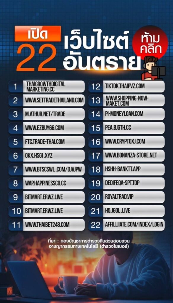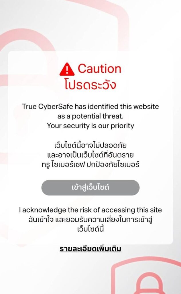 ตามที่รัฐบาลและตำรวจไซเบอร์ประกาศเตือนเกี่ยวกับ ❌ 22 เว็บไซต์อันตราย ห้ามเข้า ห้ามคลิกเด็ดขาดนั้น ลูกค้าทรู-ดีแทคสามารถมั่นใจได้ เพราะหากเผลอคลิกเข้าเว็บไซต์เหล่านี้ True CyberSafe จะทำงานทันที โดยแจ้งเตือนลูกค้า “โปรดระวังอาจเป็นเว็บไซต์อันตราย”เพื่อช่วยปกป้องเตือนภัยลูกค้าจากภัยคุกคามไซเบอร์