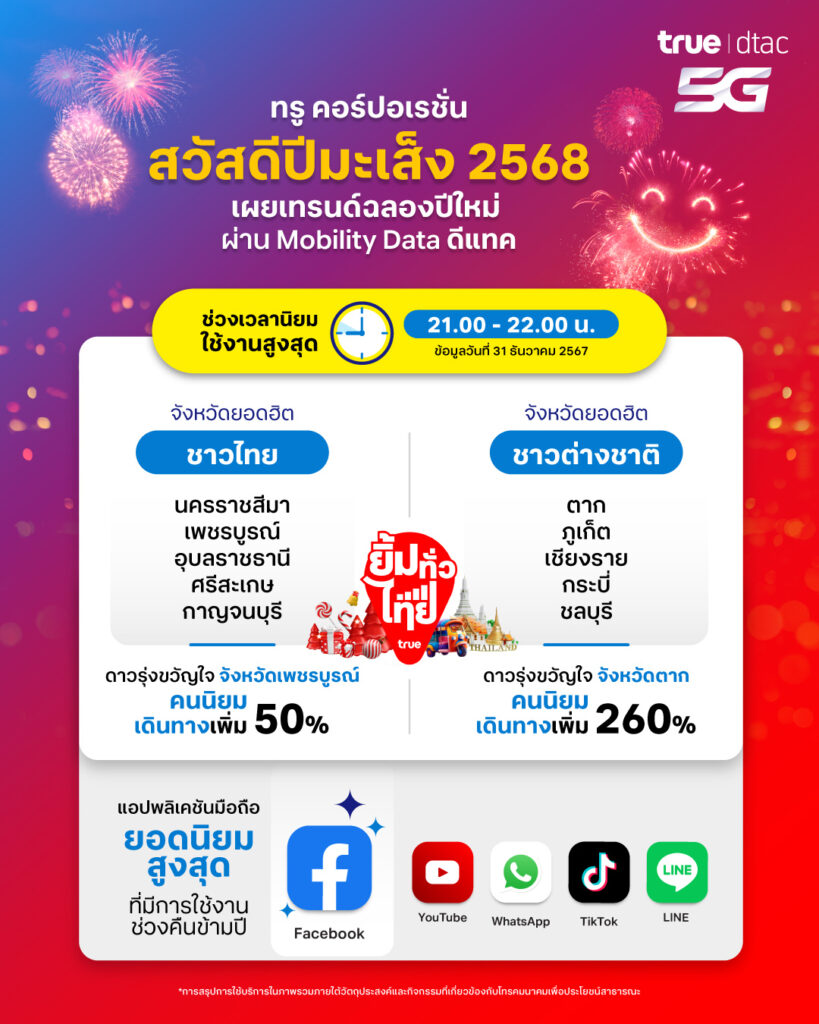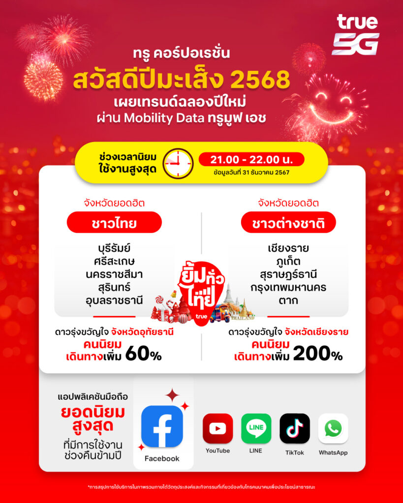 การใช้งานดาต้าเพื่อฉลองต้อนรับปีมะเส็ง 2568 พบเทรนด์การใช้งานมือถือ และเน็ตบ้านมียอดการใช้งานแบบคึกคัก ซึ่งปีนี้มาจากงานเฉลิมฉลองอย่างยิ่งใหญ่ในจุดต่างๆ ของประเทศไทย ด้าน ทรู คอร์ปอเรชั่น ได้เก็บข้อมูลการใช้ดาต้าพื้นที่ไอคอนสยามในคืนเคานต์ดาวน์สูงมากกว่า 200% จากการใช้งานในช่วงเทศกาล ด้าน Mobility Data การเดินทางท่องเที่ยวปีใหม่ และการใช้มือถือจากผู้ใช้งานแบรนด์ทรู และดีแทค ส่วนแอปทรูไอดี (TrueID) โดยรวมมียอดผู้ใช้งานในช่วงเทศกาลเพิ่มขึ้นราว 500%