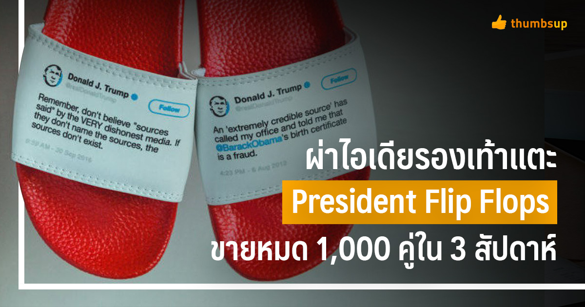 น่าสนใจมากเมื่อสำนักข่าว Time.com สัมภาษณ์ชายอเมริกันผู้หยิบเอาข้อความ Tweet ของประธานาธิบดี Donald Trump มาติดบนรองเท้าแตะแล้วจำหน่ายในชื่อ President Flip Flops จนหมดเกลี้ยง 1,000 คู่ในเวลาไม่ถึง 1 เดือน กรณีศึกษานี้สะท้อนโมเดลธุรกิจน่าทึ่งในยุคโซเชียลมีเดียที่สามารถทำเงินได้เป็นกอบเป็นกำในเวลารวดเร็ว