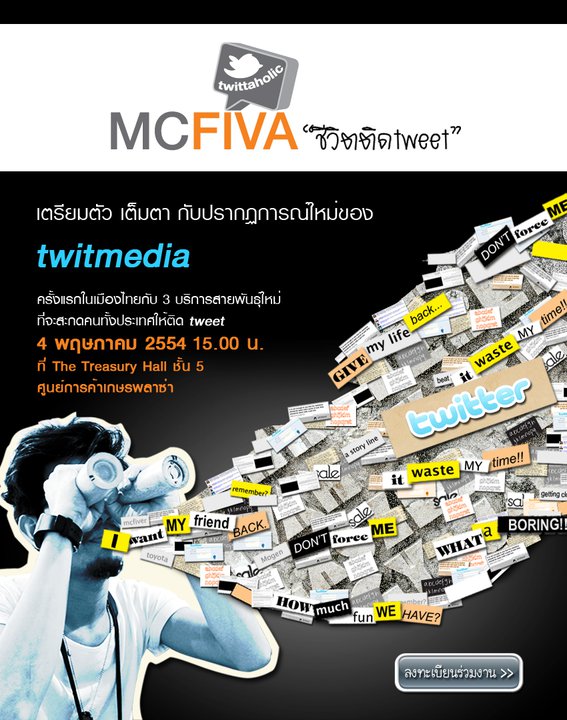 และช่างเป็นช่วงเวลาเดียวกันกับที่มีหมายแถลงข่าว 3 บริการใหม่เกี่ยวกับ Twitter ในเมืองไทยโดยเอเยนซี่โฆษณาออนไลน์ที่ชื่อ “MCFIVA” ในชื่ีองานว่า “ชีวิตติด tweet” ในวันพุธที่ 4 พฤษภาคมนี้