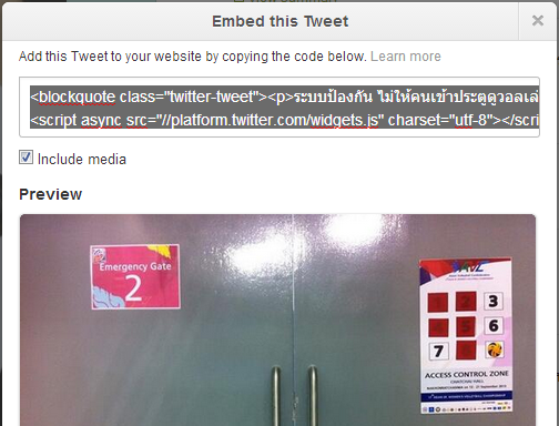 สำหรับการใช้งานก็ทำแบบเดิมคือเข้าไปที่ข้อความที่ต้องการจะใช้ในการใส่ข้อความบนหน้าเว็บ จากนั้นเลือก More และ Embed Tweet ก็จะปรากฎ Code เพื่อใช้ในการโพสต์ข้อความพร้อมตัวอย่างของภาพ โดยการแสดงภาพนั้นจะต้องเลือกที่ Include Media ด้วย