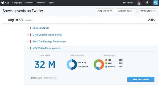 เครื่องมือใหม่ของ Twitter ชื่อ Event Targeting คือตัวช่วยล่าสุดที่จะทำให้แบรนด์สามารถวางแผนแคมเปญสดเรียลไทม์หรือ Live Campaigns ได้ล่วงหน้าหลายเดือนอย่างสุดรอบคอบ คาดนักการตลาดจะสามารถประชาสัมพันธ์เนื้อหาของตัวเองได้ง่ายขึ้นในช่วงเวลาที่มีการชมสูงสุดหรือ peak time