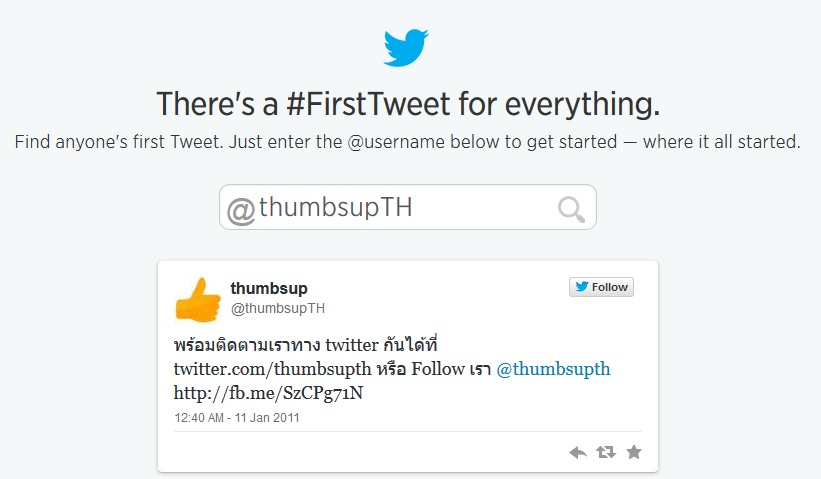 ใครที่อยากร่วมฉลองก็ใช้ #FirstTweet นะครับ โดยเข้าไปที่ Tweet tool คุณจะค้นพบทวีตแรกของคุณ เพียงแค่กรอกชื่อ @username เข้าไปก็เจอแล้ว