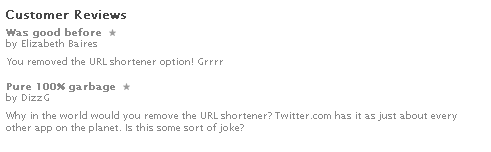 สำหรับบางคนอาจใช้บริการ 3rd Party อย่าง Hootsuite อยู่แล้วก็คงไม่ได้สนใจอะไรเพราะใช้ ow.ly แทน แต่สำหรับผู้ใช้ Twitter Client โดยตรงก็คงมี 2 กลุ่ม ถ้าเป็นผู้ใช้ทั่วๆ ไปอาจไม่ได้แคร์อะไรมาก แต่ถ้าใครที่เน้นเก็บสถิติต่างๆ ไว้อย่างที่ bit.ly ก็อาจแอบเซ็งไปนิดนึง พอเข้าไปดู Customer Reviews ใน Twitter App เจอแบบ 1 ดาวกันเลยทีเดียว